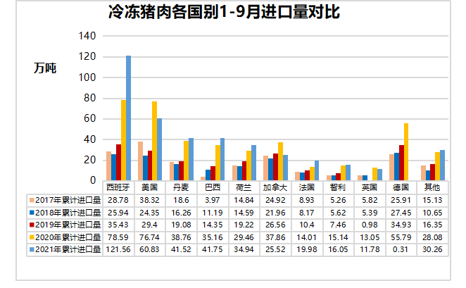 9月,中國主港豬肉進(jìn)口量30.86萬噸,環(huán)比減少19%,同比減少34%。1-9月,中國主港豬肉進(jìn)口量404.50萬噸,同比減少4%。進(jìn)口國別方面,西班牙仍是中國豬肉進(jìn)口第一大國,累計(jì)出口中國121.56萬噸,占中國豬肉進(jìn)口總量的30%。其次是美國、巴西、丹麥、荷蘭、加拿大、法國、智利、英國、愛爾蘭、墨西哥和奧地利。值得關(guān)注的是,巴西豬肉累計(jì)出口中國41.75萬噸,超過丹麥,成為中國豬肉進(jìn)口第三大國。
