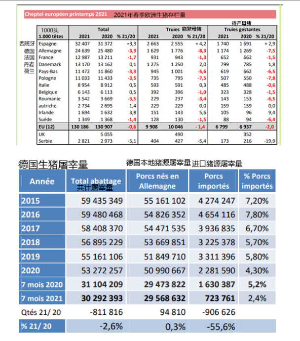 2021年第一季度,歐盟生豬存欄1.30億頭,同比減少0.6%。其中,西班牙生豬存欄3240.7萬頭,同比增加3.3%。德國生豬存欄2463.9萬頭,同比減少3.3%。法國生豬存欄1298.7萬頭,同比減少1.7%。丹麥生豬存欄1317萬頭,同比增加0.1%。荷蘭生豬存欄1147.2萬頭,同比減少3.3%。除了西班牙和丹麥能繁母豬數(shù)量同比分別有4.2%和2%的增長,德國、法國、荷蘭能繁母豬存欄均有減少。屠宰量方面,德國1-7月生豬屠宰量3029.2萬頭,同比減少2.6%。西班牙1-7月生豬屠宰量3321.1萬頭,同比+2.71%。其中,7月屠宰446.9萬頭,同比減少4.76%。