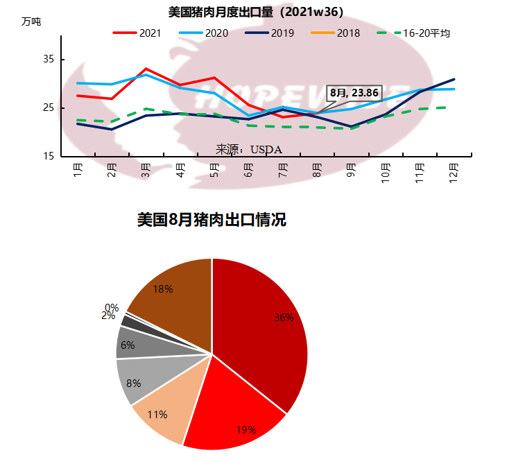 美國8月豬肉出口23.85萬噸,環(huán)比增加3.48%,同比減少0.25%。其中,出口墨西哥8.52萬噸,環(huán)比增加21.27%,同比增加50.41%,占8月美國豬肉出口總量的35.72%。墨西哥的后腿需求十分強(qiáng)勁。出口中國2.61萬噸,環(huán)比減少2.04%,同比減少49.23%,占比11%。中國本地豬肉鮮品價(jià)格便宜,凍品進(jìn)口需求持續(xù)疲軟,是出口中國下降的主要原因。出口日本4.60萬噸,環(huán)比增加3.04%,同比增加8.83%,占比19%。日本超過中國,成為美國豬肉出口第二大國。出口韓國1.34萬噸,環(huán)比減少26.13%,同比增加5.40%,占比6%。