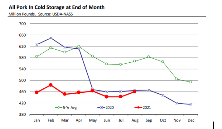 存欄方面,USDA9月1日生豬存欄數(shù)據(jù)顯示,生豬存欄7540萬頭,環(huán)比增加1%,同比減少4%。能繁母豬存欄619萬頭,同比減少2%,較6月統(tǒng)計(jì)的存欄減少0.6%。這是自2013年以來首次9月統(tǒng)計(jì)的能繁母豬存欄量低于6月統(tǒng)計(jì)的能繁母豬存欄量。預(yù)計(jì)明年春天和夏天會(huì)迎來能繁母豬存欄歷史低位。商品豬存欄6920萬頭,同比減少4%。生豬存欄量同比減少比較明顯的是體重低于120磅的,這些生豬預(yù)計(jì)在今年冬季出欄,相應(yīng)的屠宰量預(yù)計(jì)同比減少6%。