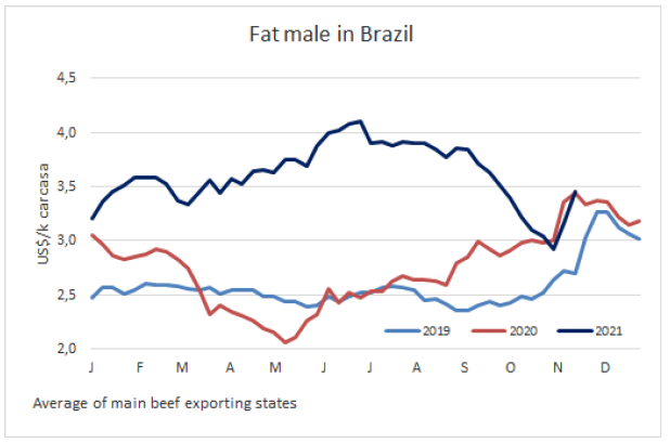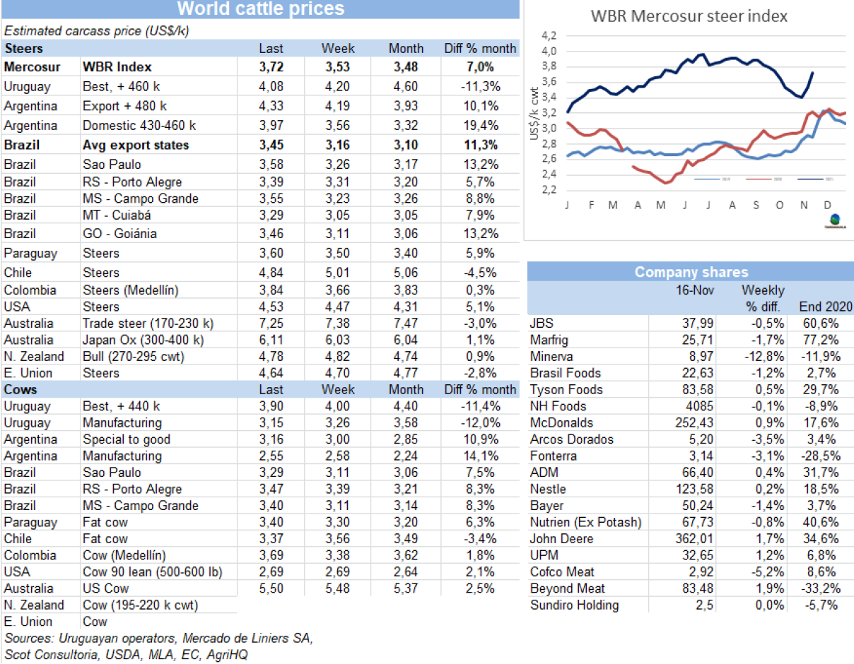 受11月前半月國內(nèi)市場(chǎng)銷售樂觀拉動(dòng),上周牛價(jià)急劇上漲。所有農(nóng)貿(mào)市場(chǎng)價(jià)格均有回漲,漲勢(shì)不均,圣保羅、米納斯吉拉斯、南馬托格羅索州的牛價(jià)一周內(nèi)上漲了10%-12%,馬托格羅索、隆多尼亞等地區(qū)牛價(jià)漲幅約6%-7%。圣保羅州活牛成交價(jià)300雷亞爾/15公斤, 9月中旬以后活牛成交價(jià)就從這一水平下滑。價(jià)格的回漲原因有供應(yīng)和需求兩個(gè)方面。11月1日,巴西國內(nèi)需求持續(xù)回升,導(dǎo)致牛肉批發(fā)價(jià)格上漲7-8%。相反,活牛供應(yīng)不充足,主要是因?yàn)橛蕡?chǎng)大規(guī)模出欄的時(shí)期已經(jīng)過去。期貨市場(chǎng)牛價(jià)格有大幅上漲,2022年1月交貨的牛參考價(jià)超過320雷亞爾/15公斤,高于中國市場(chǎng)暫停以前的活牛市場(chǎng)價(jià)格。