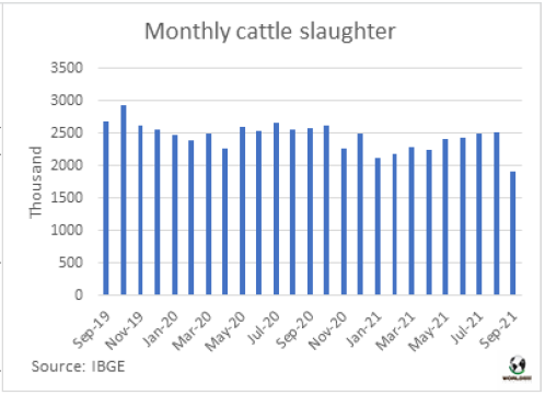 巴西地理統(tǒng)計(jì)研究所(IBGE)的調(diào)查顯示,2021年第三季度,巴西衛(wèi)生檢疫機(jī)構(gòu)注冊(cè)的屠宰場(chǎng)牛屠宰量達(dá)691萬頭。與2020年第三季度相比下降了11.1%,與2021年第二季度相比下降了2.4%。屠宰量的下降主要發(fā)生在9月份,當(dāng)時(shí)對(duì)中國的出口暫停,導(dǎo)致出口工廠的需求急劇下降。當(dāng)月牛屠宰量191萬頭,是自2004年3月(17年前)以來的最低月屠宰量。2021年第三季度牛肉產(chǎn)量(胴體重量)188萬噸,較2020年同季度下降了9.4%,較今年第二季度下降了0.4%,平均胴體重量的增長部分抵消了屠宰量的下降。今年第三季度待宰牛均重272公斤,較去年同期增長了5.2公斤。