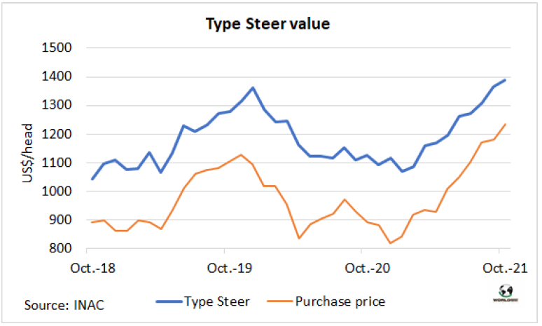 閹牛類型價(jià)值,是對(duì)牛肉工廠出售牛分割出的所有產(chǎn)品價(jià)格的加權(quán)估算,10月閹牛類型價(jià)值達(dá)歷史新高。據(jù)INAC的報(bào)告,閹牛類型價(jià)值平均1389美元,比9月增加了22美元,比去年同期增加了261美元(23%)。INAC稱這是因?yàn)椤俺隹诓课蝗夂蛧鴥?nèi)市場(chǎng)胴體價(jià)格的上漲”。相反,鮮皮、內(nèi)臟和副產(chǎn)品價(jià)值下降。相反,10月活牛采購價(jià)上漲了53美元/頭至1233美元/頭。活牛采購價(jià)與閹牛類型價(jià)值之間的差額(INAC稱之為工業(yè)增加值)本月減少了31美元至156美元,僅為閹牛類型價(jià)值的11.2%。