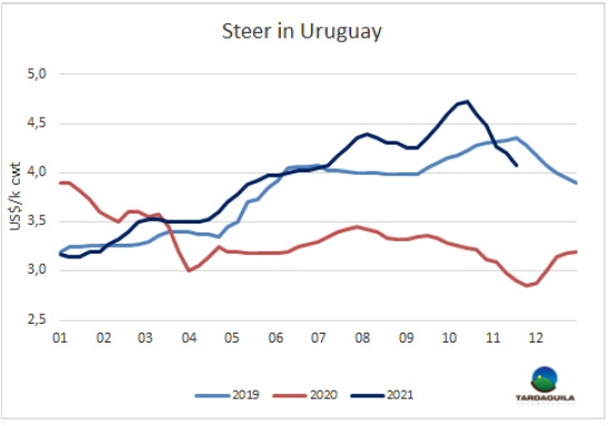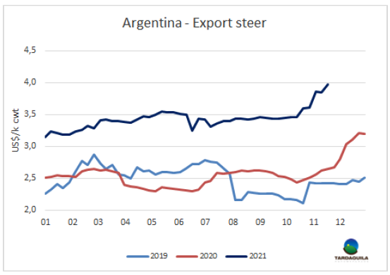 上周希爾頓臀肉出口價(jià)格急劇下跌,一系列因素給市場(chǎng)帶來不確定性。首先是歐洲市場(chǎng)對(duì)第四波疫情采取了新的管控,德國和荷蘭宣布了新的防疫限制措施,奧地利則選擇控制未接種疫苗的人口(超過30%),以遏制疫情的傳播。上周歐元走軟,人們猜測(cè)明年1月1日開放的下一個(gè)季度配額窗口會(huì)有大量481配額的牛肉進(jìn)入。盡管阿根廷方面的報(bào)盤有限,成交價(jià)達(dá)13300-13800美元/噸離岸價(jià)。最近幾天由于工會(huì)罷工屠宰活動(dòng)減少了很多。