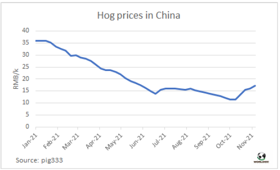 近五周內(nèi),中國毛豬價(jià)格已經(jīng)上漲近50%,從十月初的11.54元/公斤上漲至17.1元/公斤。盡管仍較年初水平低50%,這已經(jīng)是2021年截至目前第一個(gè)較大的反彈。