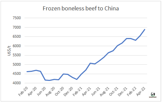 4月冰鮮牛肉對歐盟的平均出口價格達14179美元/噸,環(huán)比上漲了12%,達自2011年11月10多年以來的最高水平。這一平均價格反映了希爾頓配額內的產品價格漲幅較大,而481配額內出貨的產品漲幅相對緩和,占比小,平均價格較低。2022年前4個月,發(fā)往歐盟的冰鮮牛肉的平均價格為11893美元/噸,比2021年同期增長了32%。