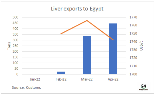 由于西方對俄羅斯的制裁,對俄出口貿易困難,促進了烏拉圭牛肝對埃及的出口。三月烏拉圭對埃及牛肝出口量336噸,四月對埃及牛肝出口量445噸,出口平均價格在1750美元/噸波動。同時對俄羅斯銷售仍處在低水平,1月和2月對俄羅斯銷售超過400噸,3-4月貿易量下降至28噸,平均價格與埃及市場價格差不多。