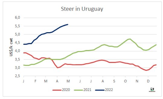 四月烏拉圭牛肉出口量34175噸,平均出口價格飆升至7370美元/噸,較上月增長了8%,創(chuàng)新紀錄。對中國出口牛肉的平均價格保持強勁上漲趨勢,基于出口請求的海關數據顯示對中國出口帶骨牛肉4992噸,去骨牛肉18483噸,去骨牛肉平均出口價格6887美元/噸,環(huán)比增長了5.2%,同比增長了36%。帶骨牛肉平均出口價格4683美元/噸,環(huán)比增長了1%。中國占四月烏拉圭牛肉出口量的 76%,30948噸中的23475噸出口到中國市場,第二大主要市場是美國(3856噸),其次是巴西(581噸)。今年第一季度烏拉圭冷凍牛肉出口量126492噸,冰鮮牛肉出口量13696噸,同比增長了19%,冷凍牛肉出口的平均離岸價格同比增長了33%,達6418美元/噸,冰鮮牛肉出口平均離岸價格增長了28%至10784美元/噸。