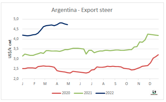 阿根廷牛肉出口協(xié)會昨日宣布,由于一些國際市場價格下跌,他們將不得不“重新分析海外銷售業(yè)務,調整成本結構”,以適應新的出口形勢。他們說,希爾頓配額的價格從17900-18000美元/噸下降到現在的15000美元/噸。481配額產品價格從11000美元/噸下降至目前的9000美元/噸。由于新冠肺炎疫情、人民幣貶值、上海港口堵塞等原因,中國市場價格每噸下降了1000美元。