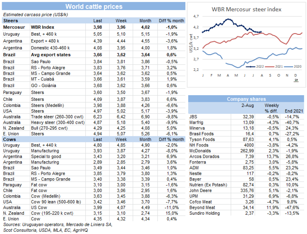 牛屠宰量連續(xù)四周走低,本周屠宰量超4萬頭。烏拉圭肉協(xié)報告,截止7月30日,一周內(nèi)牛屠宰量40150頭,環(huán)比增加了5008頭,同比減少了1.4萬頭。本周閹牛和小母牛屠宰量增長,主要是歐洲481配額的育肥牛生產(chǎn)需求。閹牛屠宰量21851頭,占54.4%,小母牛屠宰量5478頭,母牛屠宰量與上周保持同一水平,12216頭。屠宰量最高的工廠是Las Piedras,379廠,屠宰量5631頭, NH-BPU,310廠,屠宰量 4089頭和Ontilcor 439廠,屠宰量3996頭。美麗華三家屠宰場屠宰量累計10095頭,Marfrig兩家屠宰場累計屠宰量4174頭。7月屠宰149271頭牛,同比減少8.7萬頭(-37%),是2013年以來七月單月屠宰量最低。2022年前7個月,牛屠宰量累計149萬頭,僅比去年(2.6萬頭)增長了1.8%。五月底累計屠宰量的同比增幅為13.8%(13.7萬頭)。