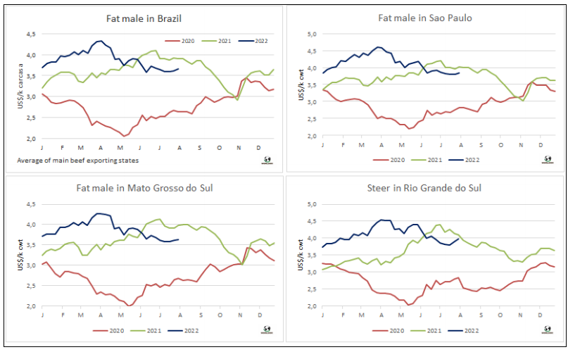 據(jù)巴西外貿(mào)部消息,七月牛肉出口均價是6549美元/噸,較六月的最高紀(jì)錄下降了4%。對中國出口價格的下跌趨勢開始在巴西牛肉出口均價中體現(xiàn)出來。七月巴西牛肉出口量167292噸,較2021年七月增長了1000噸,較2022年七月出口量的歷史最高記錄僅相差2000噸。今年1-7月巴西雷累計出口牛肉110萬噸,平均出口價格6112美元/噸,出口量同比增長了22%,價格同比增長了25%。由于生產(chǎn)成本上漲,國內(nèi)需求下降,匯率有助于出口業(yè)務(wù),預(yù)計今年的巴西牛肉出口量將創(chuàng)新紀(jì)錄。