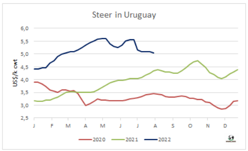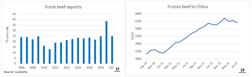 在牛肉出口量上可以感受到屠宰量的劇烈減少。據(jù)海關(guān)發(fā)布的數(shù)據(jù),七月烏拉圭牛肉出口量24863噸,達2020年八月至今兩年以來最低水平,平均出口離岸價7144美元/噸,環(huán)比下降了1.2%。中國仍是主要出口目的地,盡管對中國出口量較此前幾個月略有下降。平均每出口三噸牛肉其中兩噸出口到中國(65%),今年一月和三月對中國牛肉出口量占比曾達到72%。對中國出口的均價開始下跌。冷凍去骨牛肉平均出口價格為6504美元/噸,比6月份下跌了118美元,比4月的最高點下跌了275美元(4%)。冷凍帶骨牛肉平均價格較上月下降了264美元(5.5%)至4523美元/噸。今年前7個月,烏拉圭出口牛肉出口量累計23.8萬噸,平均出口價格7002美元/噸,出口量同比增長了5.5%,平均價格同比增長了29%。