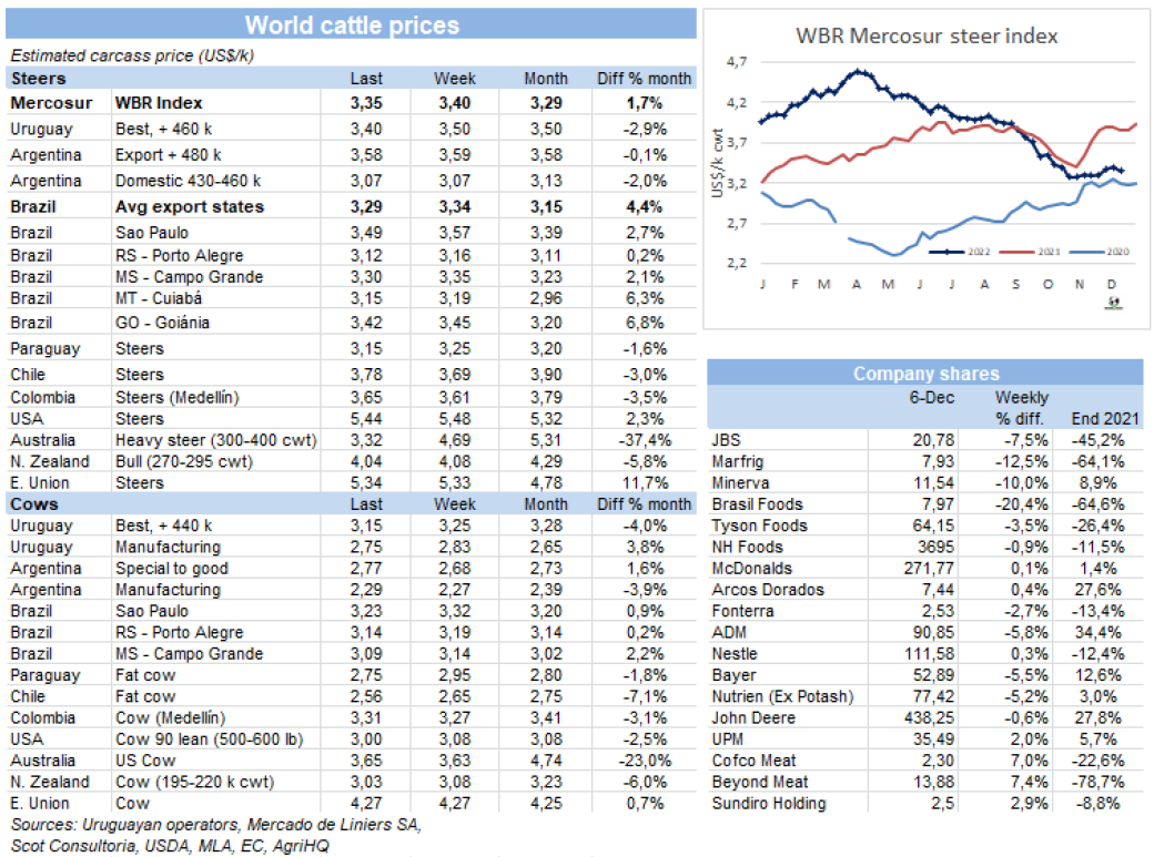 在圣誕季即將到來之際,智利市場仍有大量庫存,難以開展新業(yè)務(wù)。一位進(jìn)口商認(rèn)為,市場預(yù)計在1月的第二周重新恢復(fù)。目前的問題不是價格,而是需求。巴西19切圣地亞哥到岸價為5200美元/噸,巴拉圭19切參考價5300美元/噸。巴西和巴拉圭牛前參考價都是4600-4700美元/噸。