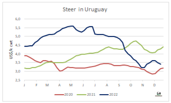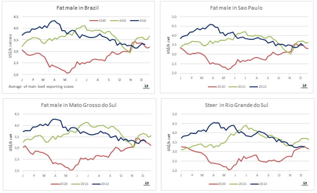 本周南方共同市場閹牛價格指數(shù)下跌了5美分,至3.35美元/公斤。巴西、巴拉圭、烏拉圭牛價走弱,阿根廷牛價保持穩(wěn)定。巴西主要出口州閹牛價格從上周的3.34美元/公斤下跌至3.29美元/公斤,且本周雷亞爾兌美元匯率調(diào)貶。