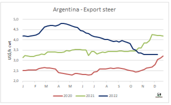 阿根廷出口閹牛價格連續(xù)四周反彈之后,結(jié)束了上漲趨勢。這最好的出口閹牛價格報價550-560比索/公斤,本地和澤布雜交牛530-540比索/公斤。特優(yōu)和良種母牛價格仍在490-500比索/公斤,主要賣到中國市場的工業(yè)母牛價格370-430比索/公斤。