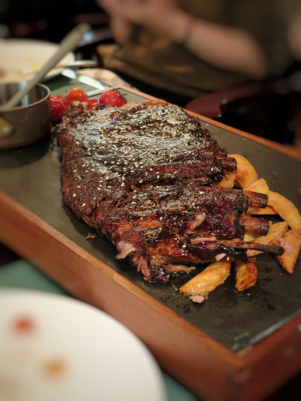 菜品介紹:美式BBQ豬肋排,在不同地區(qū)呈現(xiàn)不同的醬汁風(fēng)味。其中比較著名的有北卡羅來納North Carolina風(fēng)味,偏酸、以醋或混合番茄醬為醬汁主要基底;孟菲斯Memphis風(fēng)味,以西紅柿、醋為醬汁主要基底,并盛行一種不刷醬、僅以干料腌烤的獨(dú)特方式;堪薩斯城Kansas City-style風(fēng)味的醬汁則是甜的,輕微的辣味和番茄醬帶來濃厚的甜,如上面一道菜;芝加哥Chicago-style風(fēng)味,先用高溫炭烤封住肉品外表,鎖住汁水,再放入烤箱低溫慢烤……而《紙牌屋》主角弗蘭克愛吃的則是來自他的家鄉(xiāng)南卡羅來納South Carolina風(fēng)味豬肋排,以芥末或醋為醬汁主要基底,使得這種肋排濃香多汁,風(fēng)味獨(dú)特。