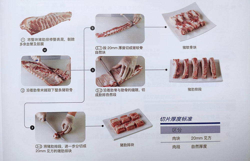 美國豬肉的谷飼飼養(yǎng)特性,基于菜式烹飪理念進(jìn)行分割,才可體現(xiàn)其多汁濃郁、鮮美回甜的特性。由于整扇肋排每個(gè)區(qū)域的帶肉率有所不同,所以在分切時(shí)需做到盡量每一份的均衡,避免客訴。