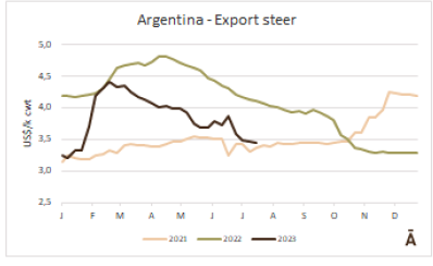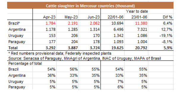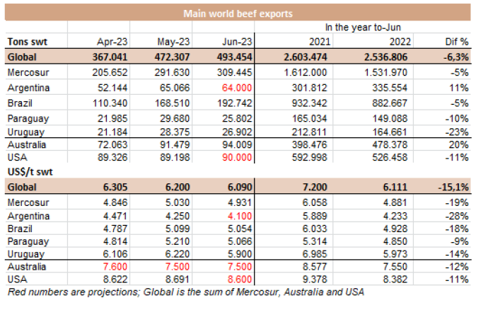 盡管國家統(tǒng)計(jì)和普查研究所(INDEC)的數(shù)據(jù)明天才能發(fā)布,根據(jù)SENASA衛(wèi)生服務(wù)局的數(shù)據(jù)估計(jì),6月份帶骨去骨牛肉出口量為64171噸,比5月份相比高1%。中國的出口量有所下降,盡管其出口額在2023年仍然是迄今為止的第二高,超過50200噸。與此同時(shí),與2022/23年關(guān)稅配額的關(guān)閉一致,對歐盟的出口量有所下降。與此同時(shí),以色列的出口量有所恢復(fù),出貨量近4300噸,比上月增加183%。對智利和美國的出口也大幅增長,與上月相比分別增長了44%和32%