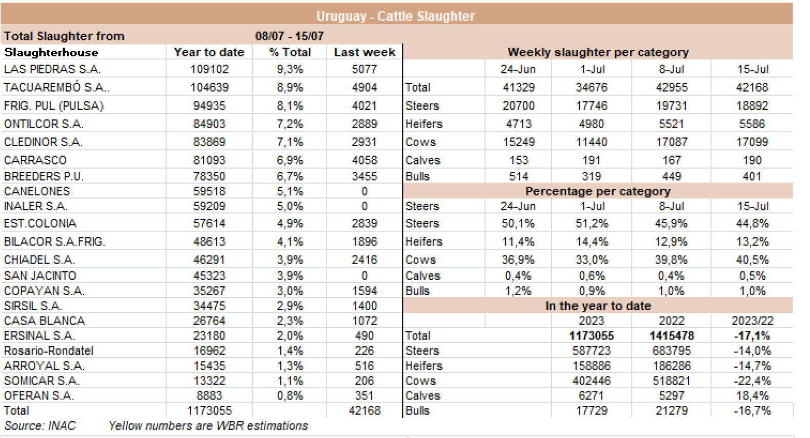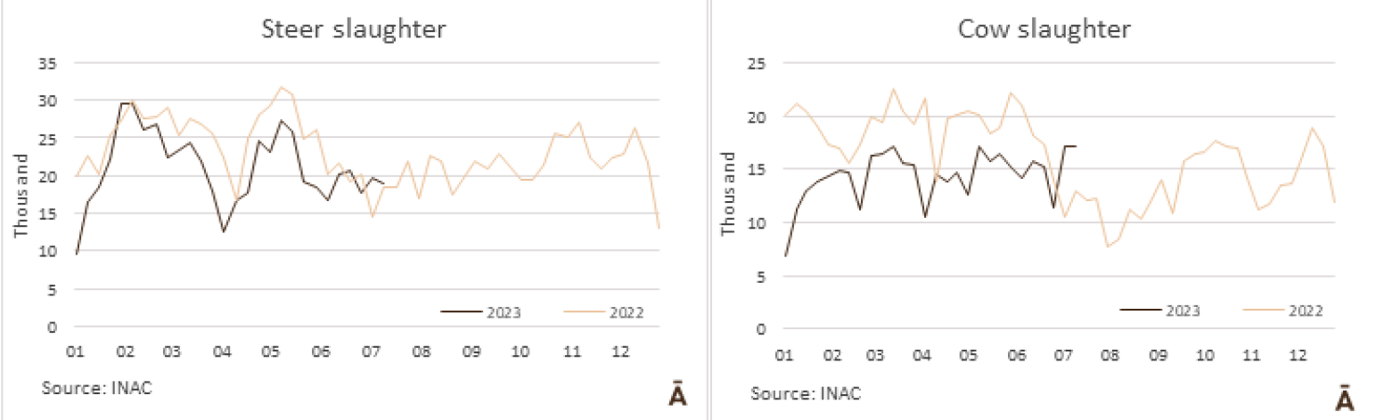 據(jù)INAC報(bào)道,在7月9日至15日的一周屠宰量42168頭牛,與七天前(42168頭)相比僅減少了1.8%。工業(yè)公牛增加了18893頭,與前一周相比下降了4.2%,而奶牛的數(shù)量17099保持穩(wěn)定。今年到目前為止,牛的屠宰總量為11.30億頭,比去年同期降低了18%。