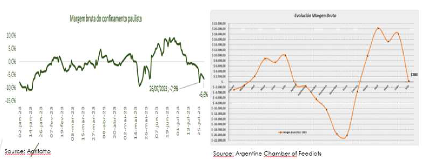 一位分析師稱,適合出口到中國的??赡軙?huì)減少,但無論如何,供應(yīng)都不會(huì)減少,飼養(yǎng)場(chǎng)的牛數(shù)量將達(dá)到700萬頭。在圣保羅,飼養(yǎng)場(chǎng)7月份的數(shù)字為負(fù)數(shù),26日達(dá)到7.9%。盡管玉米價(jià)格明顯下降,牛的價(jià)格保持相對(duì)較低,被送往屠宰場(chǎng)牛的價(jià)格下跌使數(shù)字變紅。阿格里法托說:“隨著10月23日育肥牛的價(jià)格將降至249雷亞爾/15公斤以下,超過了過去60天16%的成本下降,飼養(yǎng)場(chǎng)毛利率顯示負(fù)數(shù)。因此,預(yù)計(jì)10月和11月屠宰的動(dòng)物數(shù)量會(huì)減少是合理的。