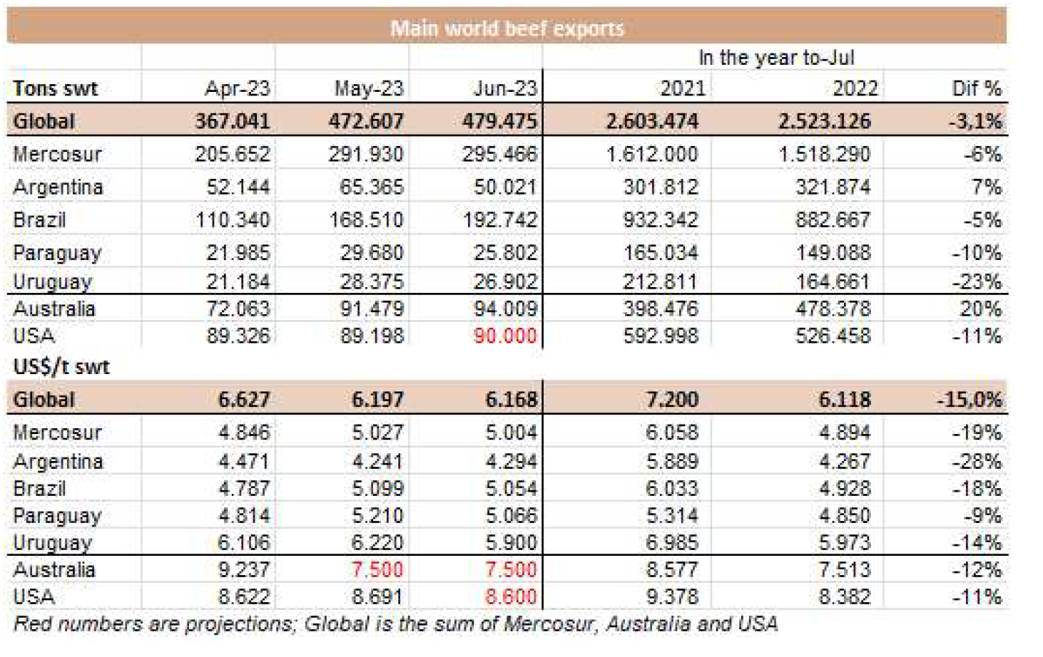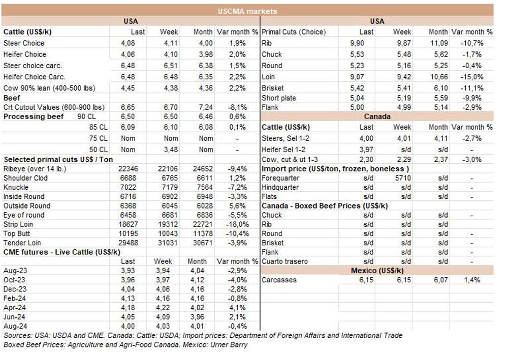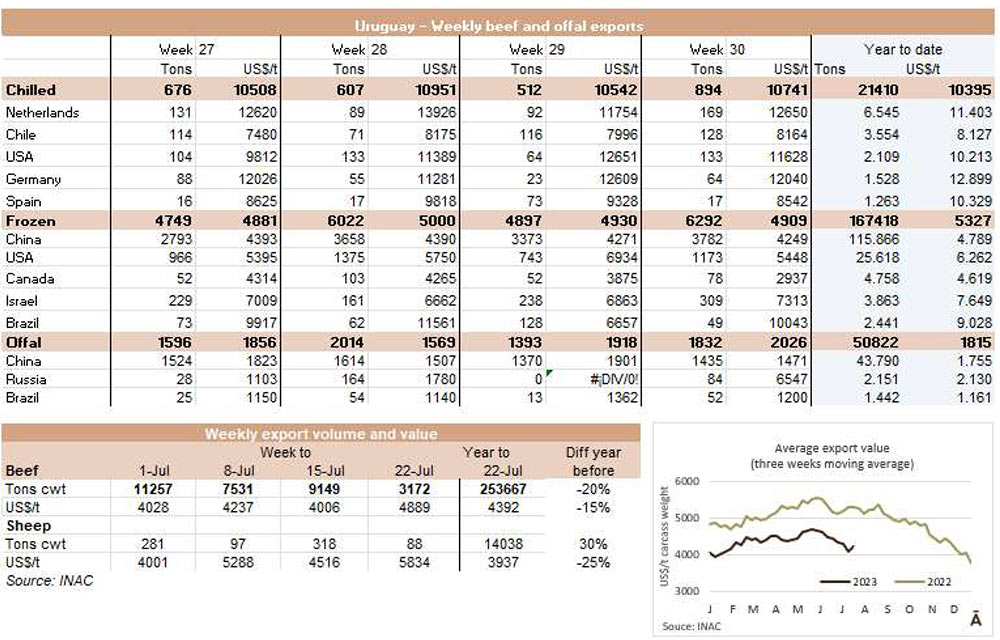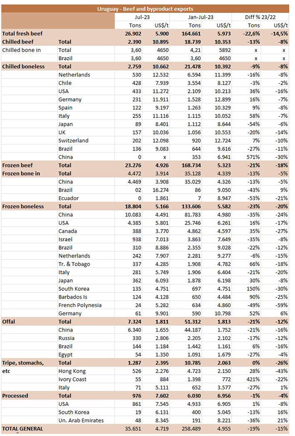 烏拉圭7月份出口了26038噸牛肉,和六月份的數(shù)據(jù)相似,比2022年7月增加了約1500噸。這是今年出口同比增長的第一個(gè)月,平均出口價(jià)格為每噸5534美元,比上月下降了240美元(-4.2%),是今年迄今為止的最低月度平均值。