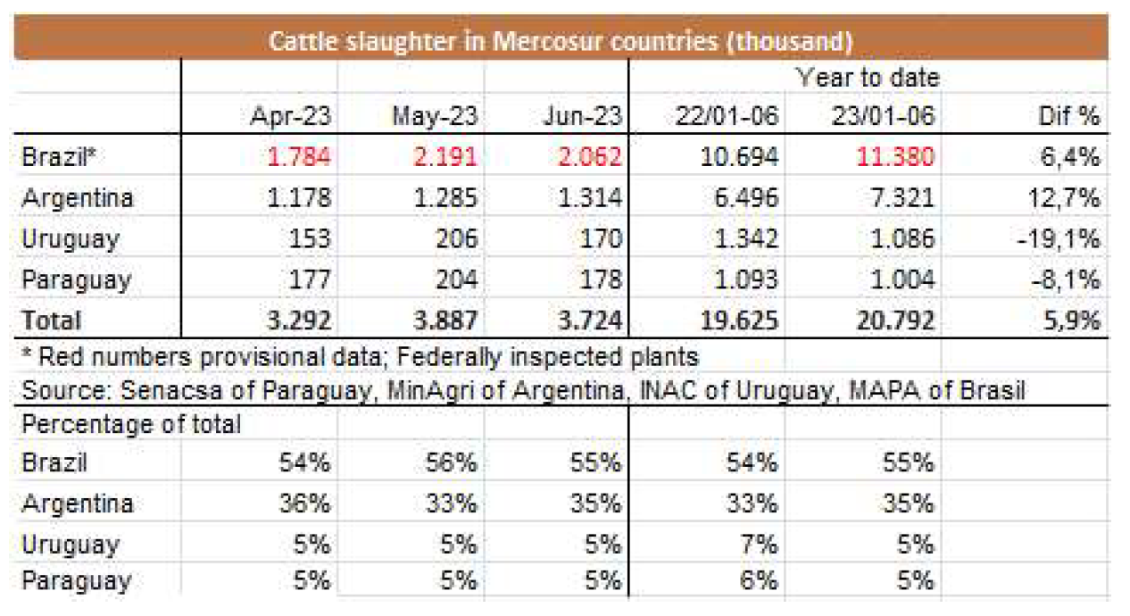 一位貿(mào)易商預(yù)測(cè),由于進(jìn)入飼養(yǎng)場(chǎng)的牛數(shù)量減少,導(dǎo)致阿根廷工業(yè)屠宰量減少,2023年下半年南方共同市場(chǎng)國家出口到中國的牛肉供應(yīng)量將減少。