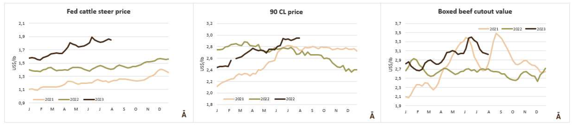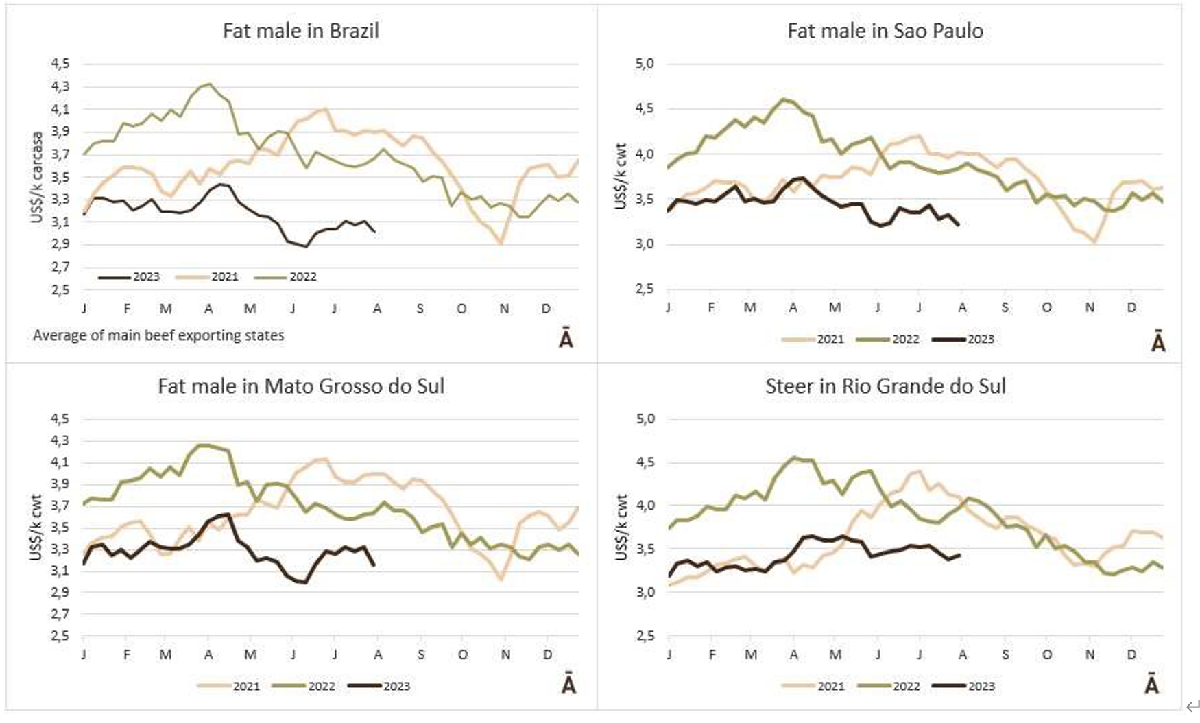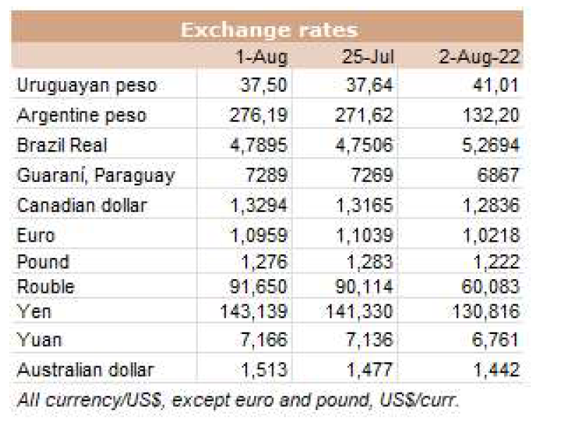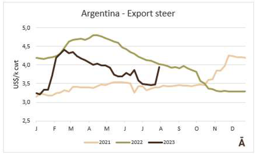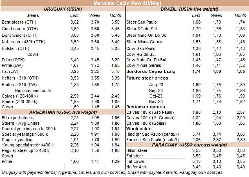 阿根廷出口公牛的價(jià)格本周爆炸式增長了50美分至每公斤酮體4.30美元(包括9%的出口稅)。而巴西恰恰相反,那里的包裝公司被收購以此壓低價(jià)格。出口州的平均每公斤損失9美分至每公斤3.02美元,成為該地區(qū)的最低價(jià)格參考值。烏拉圭的牛的價(jià)格也面臨下行壓力,主要是質(zhì)量最重、最好的公牛,價(jià)格為3.60美元左右。在巴拉圭,良好的飼料條件要求牛肉維持3.50美元左右的市場(chǎng)價(jià)格。