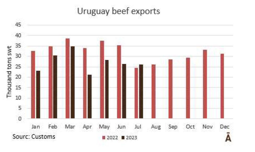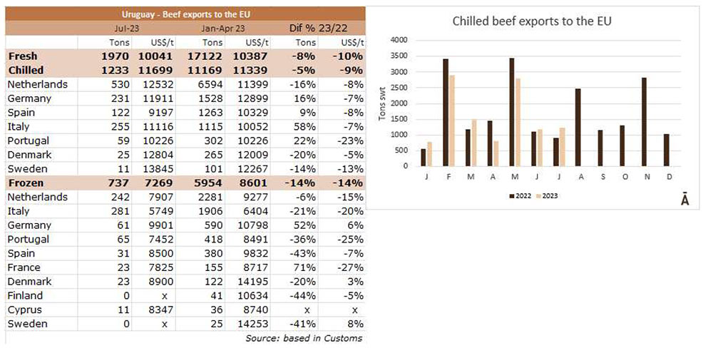 在截至7月的一年中,烏拉圭向歐盟國家出口了17122噸牛肉,比2022年同期減少了8%。主要是冷凍食品的下降,為14%, 冰鮮產(chǎn)品下降了5%。