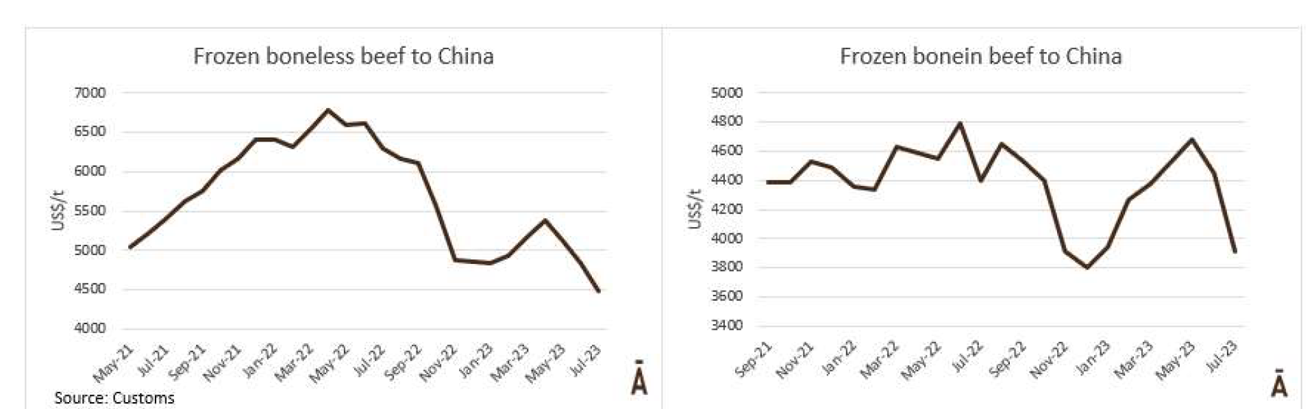 7月份,出口中國的帶骨牛肉為4469噸,平均價(jià)格是3914美元/噸。去無骨牛肉為10083噸,平均價(jià)格為4491美元/噸,這個(gè)月的價(jià)格有一個(gè)暴跌。出口中國的冷凍牛肉平均價(jià)格為4312美元/噸,為9個(gè)月前2021年2月以來的最低值。在截至7月的累計(jì)一年中去骨牛肉下降了35%,帶骨牛肉下降了13%。