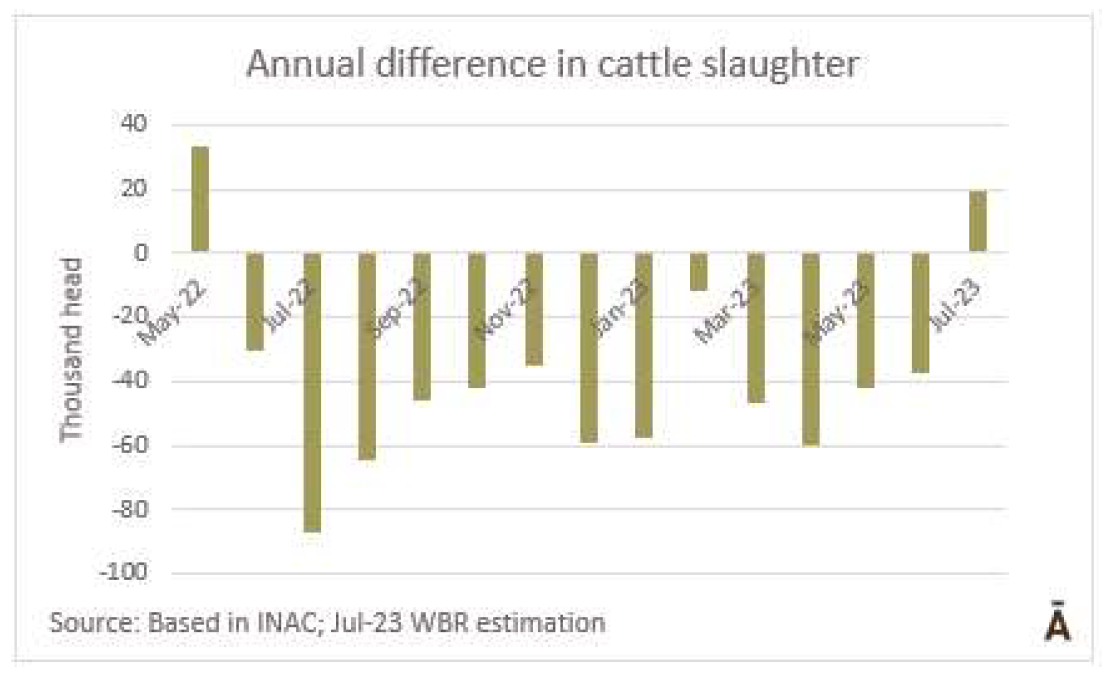 根據(jù)SENASA臨時(shí)數(shù)據(jù),7月份的屠宰許可包括129萬頭牛,比前一個(gè)月減少了1%,但是比一年前增加了14%。年度增幅最大的品種是小母牛(26%),其次是奶牛(19%)和幼牛(16%),對(duì)公牛的屠宰沒有改變。與5月和6月的比例一致,7月母牛屠宰比例為48.7%,比去年同月增加了三個(gè)百分點(diǎn)。