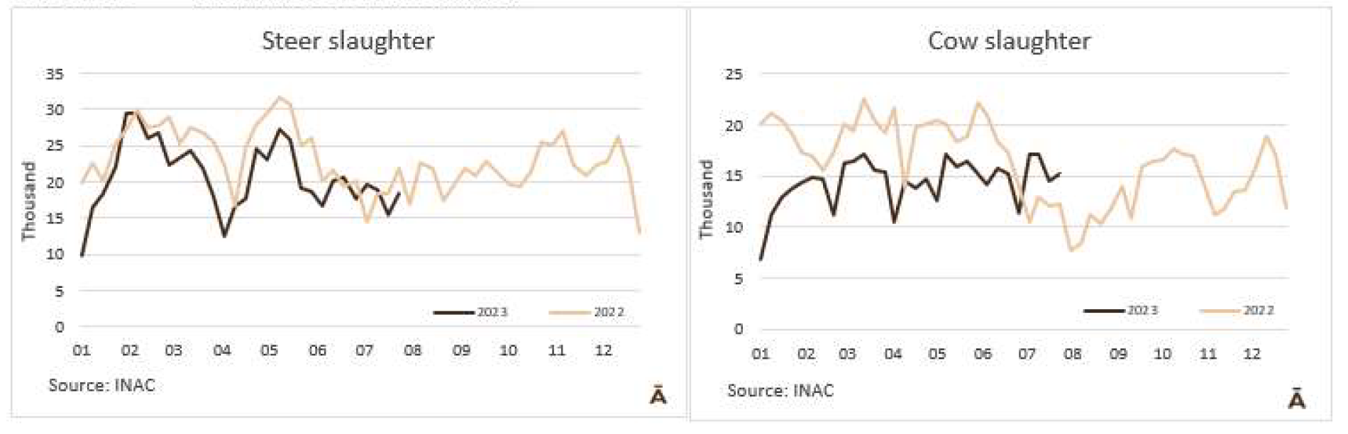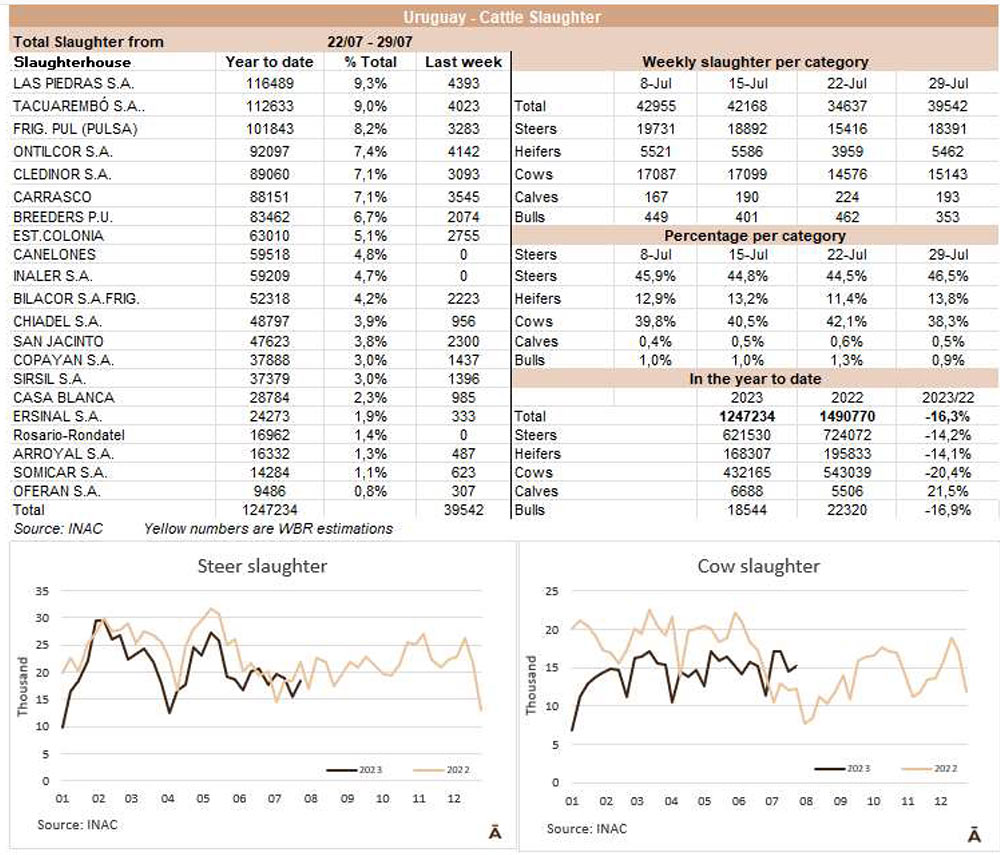牛的屠宰量連續(xù)兩周保持在40000頭以下。INAC報(bào)告稱,在截至7月29日的一周內(nèi),有39542頭牛進(jìn)入工廠,比前一周(由于7月18日假期)多了近5000頭,但比去年同期減少了2%。隨著481配額活動(dòng)的開始,被屠宰的公牛和小母牛的比例有所增加,而奶牛的比例有所下降。與前一周相比,公牛增加了19%達(dá)到了18391頭,小母牛增加了38%達(dá)到5462頭,而奶牛只增加了4%,數(shù)量為15143頭,占屠宰總數(shù)的38%,比前一周減少了4個(gè)百分點(diǎn)。屠宰量最多的工廠為Las Piedras(4393)、Ontilcor(4142)和Marfrig-Tacuarembo(4023)。Marfrig屠宰量是9871頭(每周增加13%),而其他兩個(gè)工廠屠宰了6828頭牛(每周減少4%)。今年7月有161731頭牛被屠宰,去年7月只有149300頭牛被屠宰,因此年度比較有所增加,這是前13個(gè)月沒有發(fā)生過的