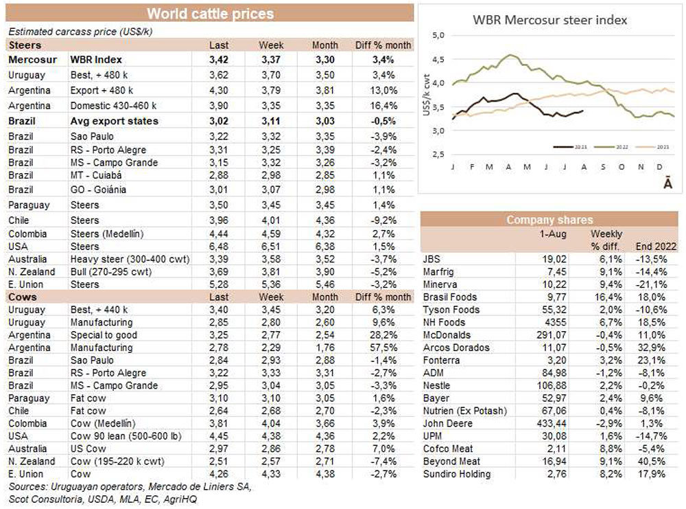 上周末,阿根廷農(nóng)場(chǎng)到屠宰場(chǎng)的價(jià)格大幅上漲,并推高了地區(qū)平均值,盡管巴西本周呈下跌趨勢(shì)。WBR南方共同市場(chǎng)公牛指數(shù)上漲5美分至每公斤酮體3.42美元,為10周來的最高值。