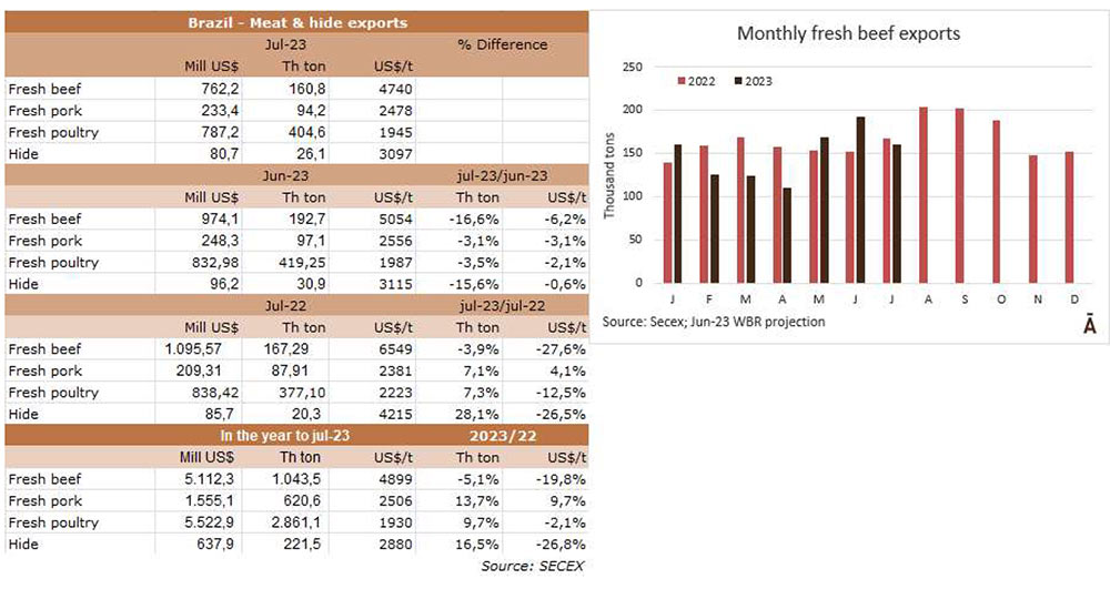 根據(jù)外貿(mào)部(SECEX)的信息,巴西7月份出口了160795噸牛肉,平均價(jià)值為4740美元/噸。與6月份相比,產(chǎn)量減少了近3.2萬噸,但同比僅減少了6.5萬噸。平均出口價(jià)格在月度比較中下降6.2%,在年度比較中下降27.6%。因此,與去年同月相比,巴西的出口量在5月和6月出現(xiàn)了復(fù)蘇。今年至7月份,巴西出口了104萬噸牛肉,比2022年同期減少了5.6萬噸(-5.1%);與每噸4899美元相比,平均出口價(jià)格下降了20%。