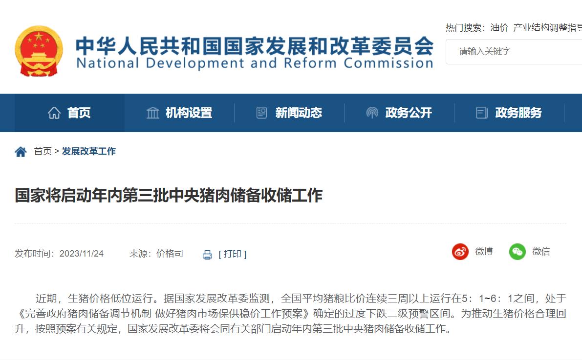 近期,生豬價(jià)格低位運(yùn)行。據(jù)國家發(fā)展改革委監(jiān)測(cè),全國平均豬糧比價(jià)連續(xù)三周以上運(yùn)行在5:1~6:1之間,處于《完善政府豬肉儲(chǔ)備調(diào)節(jié)機(jī)制 做好豬肉市場(chǎng)保供穩(wěn)價(jià)工作預(yù)案》確定的過度下跌二級(jí)預(yù)警區(qū)間。為推動(dòng)生豬價(jià)格合理回升,按照預(yù)案有關(guān)規(guī)定,國家發(fā)展改革委將會(huì)同有關(guān)部門啟動(dòng)年內(nèi)第三批中央豬肉儲(chǔ)備收儲(chǔ)工作。