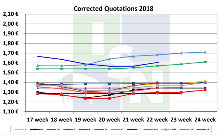 法國生豬價(jià)格上漲幅度1.2歐分,法國供屠宰的生豬數(shù)量在下降。奧地利和德國上漲3歐分。奧地利生豬數(shù)量下降15%,主要原因是天氣太熱。西班牙生豬體重在下降。荷蘭和丹麥生豬價(jià)格沒有變化。丹麥生豬價(jià)格已經(jīng)連續(xù)11周保持不變。德國四家大型屠企(Toennies、Vion、Westfleisch、Danish