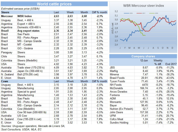 本周南方共同市場(chǎng)閹牛指數(shù)保持在2.63美金/公斤,本周阿根廷比索再度貶值4.1%,雖然本地閹牛價(jià)格上漲,但換算成美金還低了10美分,2.56美金/公斤,而巴西亞雷爾增值1.5%,雖然閹牛價(jià)格低了1亞雷爾/公斤,換算成美金還高了2美分,2.36美金/公斤。烏拉圭和巴拉圭牛價(jià)幾乎不變。