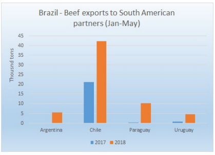 由于亞雷爾兌美元貶值嚴(yán)重,巴西牛價(jià)大幅下滑,使得2018年對(duì)南美其他國(guó)家出口量增長(zhǎng)兩倍,一到五月總共對(duì)智利,阿根廷,巴拉圭和烏拉圭出口62400噸牛肉,其中冷凍牛肉增幅比冷鮮要高,但是平均牛價(jià)與去年同期相比從4343美金降低到3711美金。南美主要牛肉進(jìn)口國(guó)智利從巴西進(jìn)口了42300噸牛肉,比去年同期增長(zhǎng)一倍,主要是巴西牛價(jià)低以及巴拉圭某些工廠關(guān)閉導(dǎo)致。預(yù)期今年巴西對(duì)南美地區(qū)出口會(huì)一直保持在高水平。
