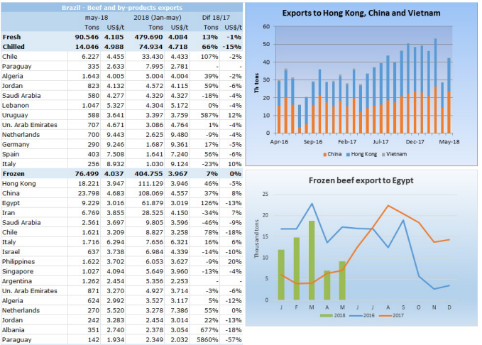 巴西對(duì)中國(guó)牛肉直接出口量超過(guò)了去香港的量,達(dá)到了23798噸,香港為18221噸,主要是近期從香港到中國(guó)運(yùn)輸很困難,不過(guò)一到五月出口香港的牛肉還是最多,達(dá)到了111129噸,然后是出口中國(guó)108069噸。中國(guó)香港和越南五月一共買了42162噸,比四月份28619噸增加了47%,比去年五月增加25%。第三大出口國(guó)是埃及,五月共買了9229噸,雖然比四月多了7000噸,還是遠(yuǎn)低于第一季度平均水平。