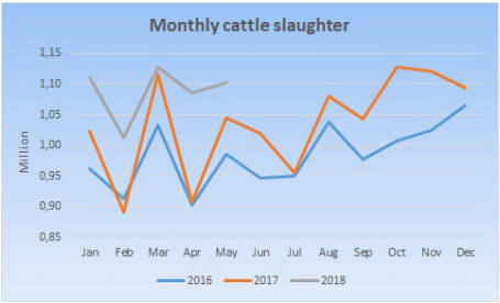 澳洲天氣干旱活牛供應(yīng)增加,導(dǎo)致五月出口量大增,五月總出口109700噸,歷史上只有2015年五月由于干旱原因出口量更高。五月出口量比四月高了21500噸,即24%,比去年五月高15%。五月總共屠宰58萬(wàn)頭,比去年同期增長(zhǎng)10%,一至五月總屠宰269萬(wàn)頭,比17年增加8%。出口到亞洲的牛肉總量創(chuàng)下了月度紀(jì)錄,比之前最高峰高了10%,亞洲國(guó)家比如印尼,南韓,日本和中國(guó)需求都增長(zhǎng)不少,一至五月出口日本125700噸,同比增長(zhǎng)12%,出口美國(guó)91700噸,同比增長(zhǎng)4%,出口韓國(guó)61700噸,同比增長(zhǎng)15%,出口中國(guó)59400噸,同比增長(zhǎng)40%。