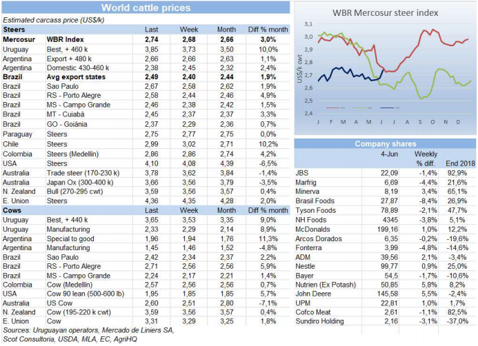 南方共同市場(chǎng)閹牛價(jià)格上漲6美分到2.74美金/公斤,三月中以來(lái)最高,主要驅(qū)動(dòng)力來(lái)自巴西雷亞爾,雖然對(duì)經(jīng)濟(jì)增長(zhǎng)減速有所擔(dān)憂(yōu),本周還是增值3.5%,主要出口州牛價(jià)只上漲了0.3雷亞爾/15公斤,到141雷亞爾,但換算成美金牛價(jià)上漲了9美分到2.49美金。烏拉圭活牛市場(chǎng)還是過(guò)熱,閹牛價(jià)格本周再度上漲12美分,比其他國(guó)家都高了1美元/公斤以上。阿根廷和巴拉圭牛價(jià)沒(méi)有變化。
