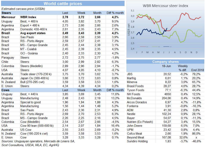 活牛價(jià)格堅(jiān)挺、貨幣穩(wěn)定推高了南方共同市場閹牛價(jià)格,本周增長了6美分到2.78美金/公斤,達(dá)到2018年五月以來最高值。巴西重新可以出口中國之后,活牛價(jià)格上漲,把之前的跌幅全部漲回來了,主要出口州育肥閹牛價(jià)格漲了3雷亞爾/15公斤,達(dá)到140.5雷亞爾,換算成美金漲了6美分到2.49美金。烏拉圭牛價(jià)漲到4美金以上,自2011年以來第一次,阿根廷閹牛價(jià)格和上周一樣,但比索增值2.6%,美金牛價(jià)漲了7美分到2.73美金,只有巴拉圭牛價(jià)小幅下跌3美分到2.72美金。