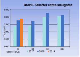 第一季度巴西共屠宰了789萬頭牛,同比增加121060頭(即1.6%),但還是比前一季度低3.6%。