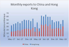 五月對(duì)中國的直接出口量達(dá)到去年十一月以來最高