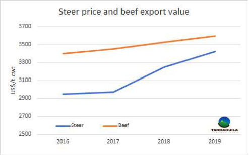 2017年國家肉類協(xié)會(huì)審查的16家工廠里有11家虧損,而現(xiàn)在的情況只會(huì)更糟,因?yàn)檎汲杀?span lang="EN-US">70-80%的活牛采購價(jià)格上漲的比牛肉銷售價(jià)格高出太多,2017年閹牛采購均價(jià)大約2970美金/噸,而平均出口價(jià)格為3452美金,差價(jià)約16%。2018年烏拉圭活牛市場由于更加缺牛,閹牛采購價(jià)格漲到3250美金/噸,而出口均價(jià)漲幅不大,因此差價(jià)縮小到9%。2019年至今牛價(jià)大幅上漲,閹牛采購均價(jià)漲到3420美金/噸,只比出口均價(jià)3593美金低不到5%。