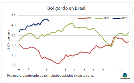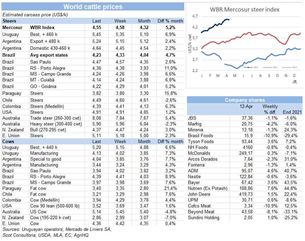 巴西牛肉出口平均價(jià)格持續(xù)上漲。 外貿(mào)部報(bào)告顯示,四月前六個工作日巴西牛肉出口量48148噸,平均價(jià)格6159美元/噸。平均單日出口量8025噸,較去年四月增長了28%。平均出口價(jià)格同比增長了29%,較今年3月增長了22%。近幾周巴西對中國出口價(jià)格下降,我們將看到出口平均價(jià)格下降。