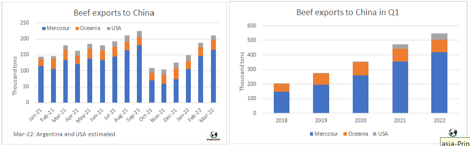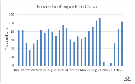 三月主要出口國對中國市場牛肉出口量超20萬噸,僅在去年八月和九月出口量超過該數(shù)量。巴西的發(fā)運(yùn)量強(qiáng)勁是主要原因,從烏拉圭、澳洲的發(fā)運(yùn)量也很大。2022年第一季度,向中國出口牛肉的全球主要牛肉供應(yīng)國出貨量約為21.2萬噸,僅低于2021年9月的紀(jì)錄。出口量同比增長16%(約7.6萬噸)。