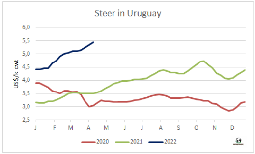 供應(yīng)短缺和價(jià)格普遍上漲繼續(xù)推高出口閹牛價(jià)格。上周牛價(jià)上漲了10-15比索,自今年年初以來,累計(jì)上漲了90-110比索。英國純種閹牛參考價(jià)530-545比索之間,比今年年初上漲了25%,而瘤牛雜交品種的價(jià)格上漲到490-510比索/公斤,今年迄今為止上漲了21%。特優(yōu)母牛供應(yīng)稀缺,上周價(jià)格上漲了20比索至460-480比索/公斤,與3個月前相比累計(jì)上漲了31%。主要賣到中國市場的工業(yè)母?,F(xiàn)在的價(jià)格約為420-430比索/公斤,比2022年初上漲了27%。
