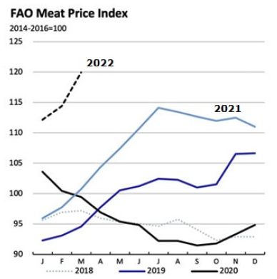 根據(jù)糧農(nóng)組織的數(shù)據(jù),三月肉類價(jià)格暴漲,創(chuàng)歷史新高