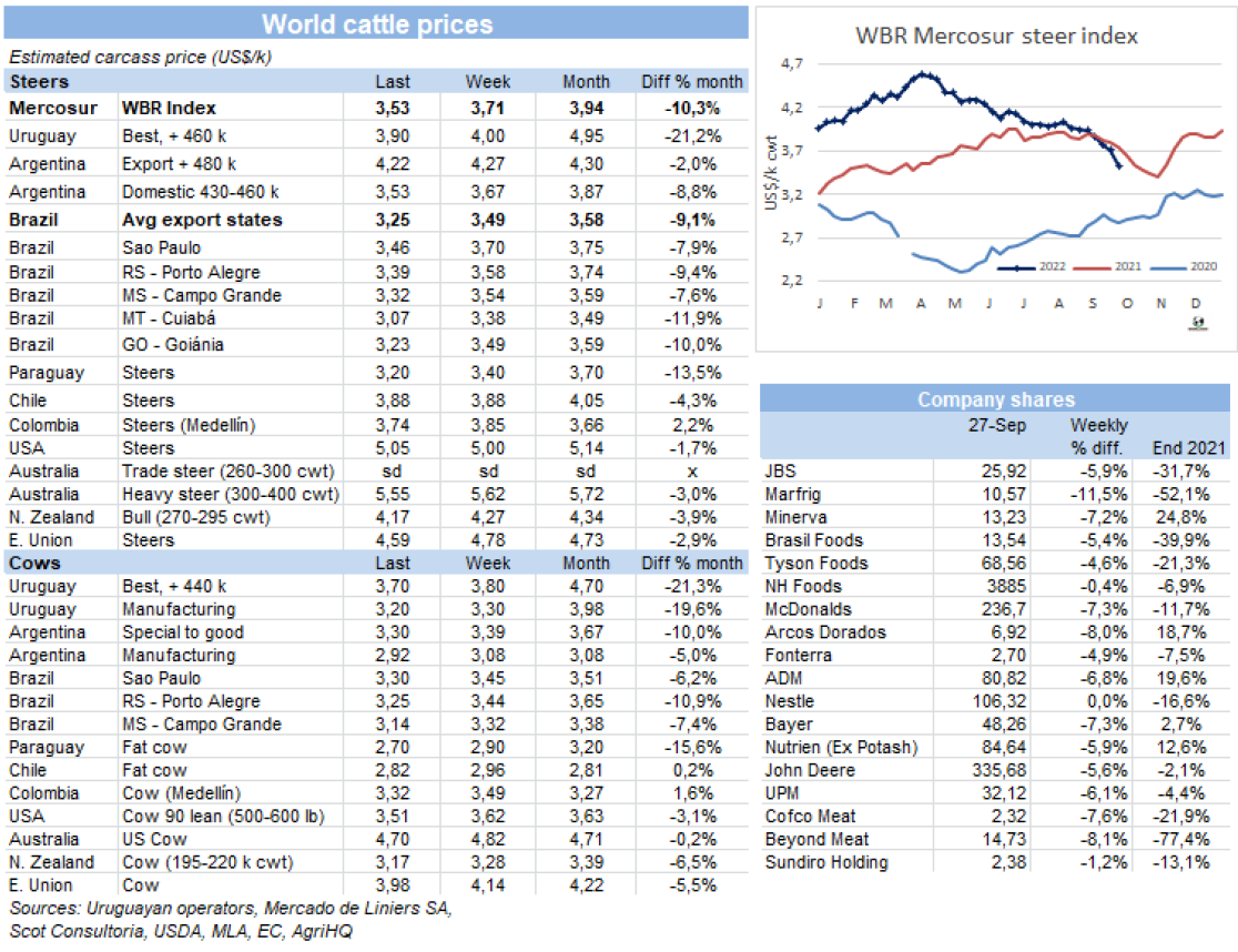 與上周一樣,南方共同市場(chǎng)四國(guó)閹牛價(jià)格急劇下跌。本周閹牛價(jià)格指數(shù)下跌了18美分至3.53美元/公斤,達(dá)去年11月初以來(lái)最低。受雷亞爾價(jià)格下跌和本周貨幣貶值4.6%影響,巴西主要出口州育肥牛價(jià)格下跌了24美分至3.25美元/公斤。阿根廷方面,出口閹牛的比索價(jià)格保持穩(wěn)定,美元價(jià)格下跌了5美分至4.22美元/噸,含9%出口稅。烏拉圭牛價(jià)仍保持下跌,特種閹牛參考價(jià)3.9美元/公斤。巴拉圭方面工廠把采購(gòu)價(jià)格調(diào)低20美分,待宰公牛價(jià)格3.2美元/公斤。