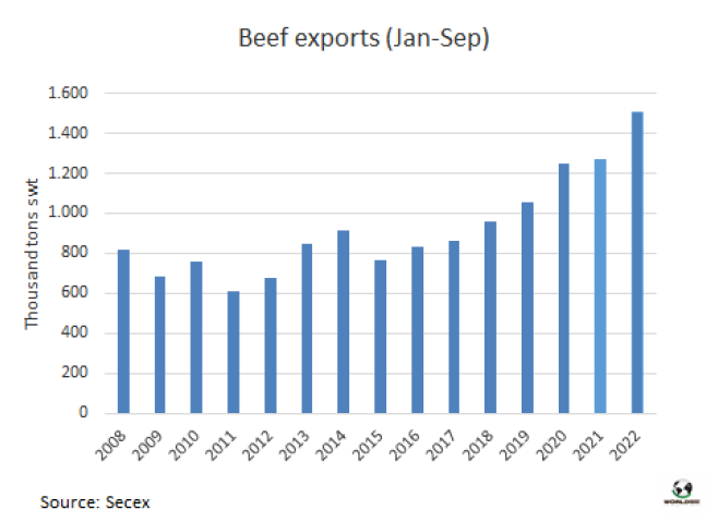 俄羅斯取消了一年前對(duì)馬托格羅索州和米納斯吉拉斯州屠宰場(chǎng)的牛肉出口實(shí)行的限制,這些限制是2021年在這兩個(gè)州發(fā)現(xiàn)非典型“瘋牛病”病例后實(shí)行的。俄羅斯農(nóng)業(yè)部聯(lián)邦衛(wèi)生和植物衛(wèi)生監(jiān)督局的一份聲明報(bào)告稱,“截至2022年9月21日,鑒于巴西境內(nèi)牛海綿狀腦病疫情的改善,之前實(shí)行的臨時(shí)限制被取消”。俄羅斯一直要求只接受30個(gè)月以下被屠宰的動(dòng)物的去骨牛肉。符合要求的產(chǎn)品出口時(shí),還需要一個(gè)衛(wèi)生證書來(lái)證明符合條件。這些限制現(xiàn)在已被取消。